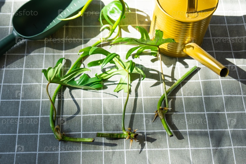 Макет на столе ростка филодендрона с корнями и оборудованием для посадки домашних растений