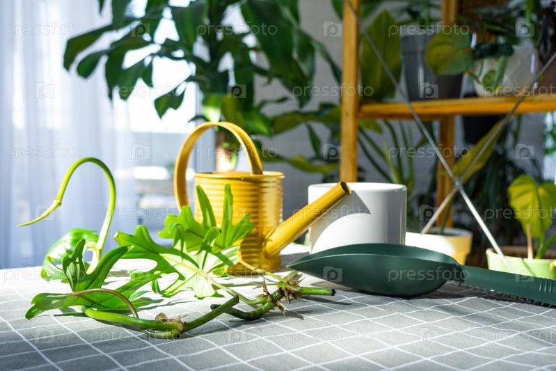 Макет на столе ростка филодендрона с корнями и оборудованием для посадки домашних растений