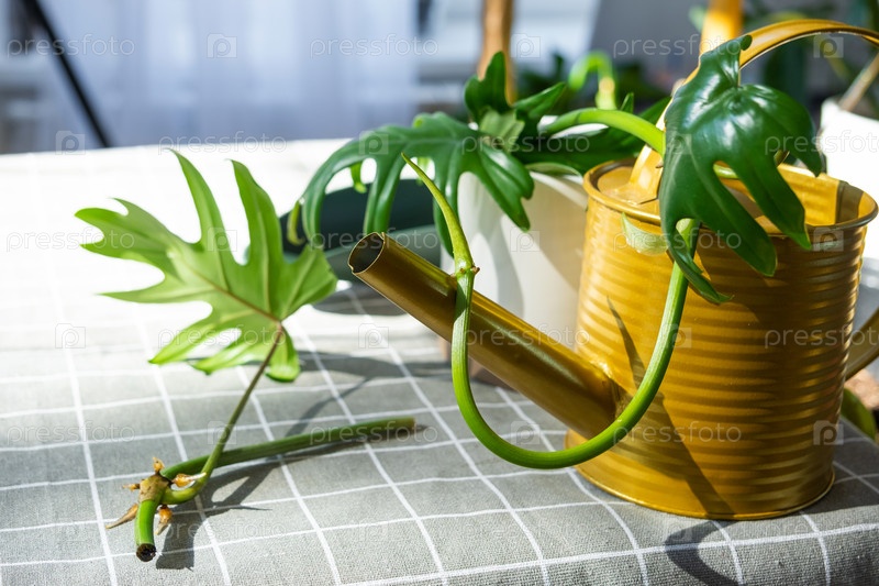 Макет на столе ростка филодендрона с корнями и оборудованием для посадки домашних растений