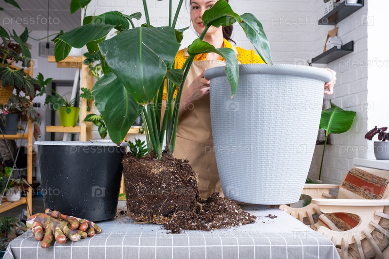 Пересадка домашнего растения стрелиция николай в новый горшок большая корзина в домашнем интерьере. Женщина в фартуке, удивленная большим размером, ухаживает за растением в горшке, стрелиция королевская