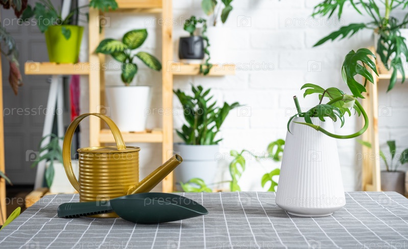 Посадка домашнего растения филодендрон с укоренившимся стеблем в новый горшок в интерьере дома. Уход за растением в горшке, земляной ком с корнями, раскладка садового инвентаря на столе