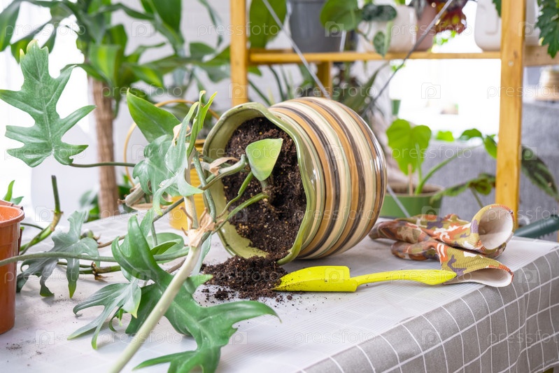 Пересадка домашнего растения Филодендрон в новый горшок в интерьере дома. Уход за растением в горшке, земляной ком с корнями, раскладка садового инвентаря на столе