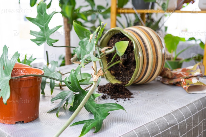Пересадка домашнего растения Филодендрон в новый горшок в интерьере дома. Уход за растением в горшке, земляной ком с корнями, раскладка садового инвентаря на столе