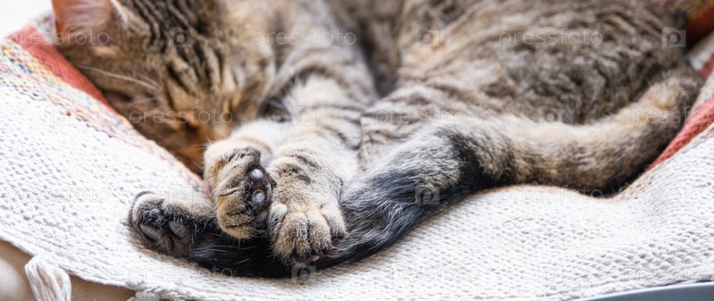 Кот быстро сладко спит на стуле в смешной позе, Комфортный беззаботный сон животного крупным планом