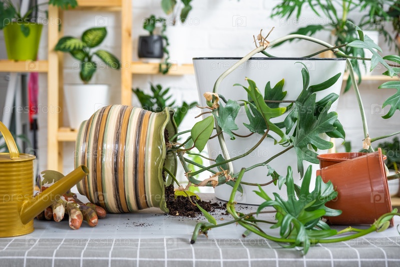 Пересадка домашнего растения Филодендрон в новый горшок в интерьере дома. Уход за растением в горшке, земляной ком с корнями, раскладка садового инвентаря на столе