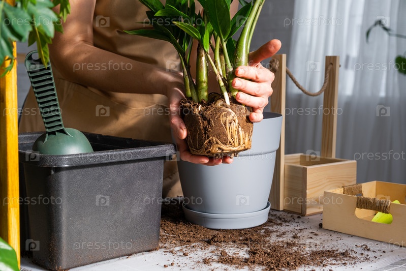 Пересадка разросшегося домашнего растения сочного замиокулькаса с комком корней и луковицы в новый горшок большего размера. Уход за растением в горшке, руки женщины в фартуке, макет