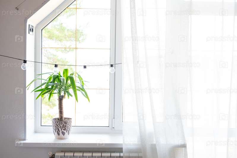 Комнатное растение юкка в горшке на подоконнике у трапециевидного окна на чердаке дома. Уют и дом, минимализм