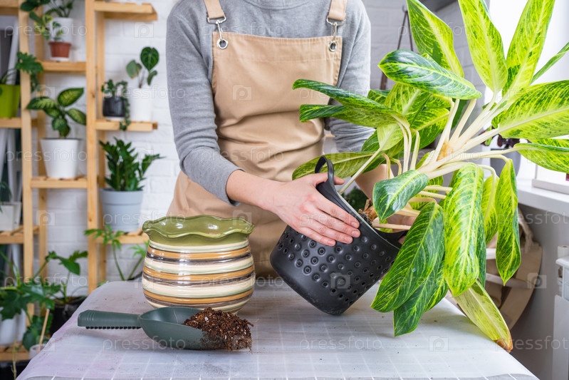 Пересадка домашнего растения аглаонемы в новый горшок в интерьере дома. Женщина в фартуке Уход за растением в горшке