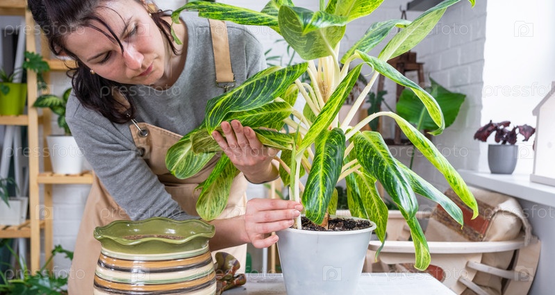 Пересадка домашнего растения аглаонемы в новый горшок в интерьере дома. Женщина в фартуке отделяет ребенка от материнского растения, вегетативное размножение