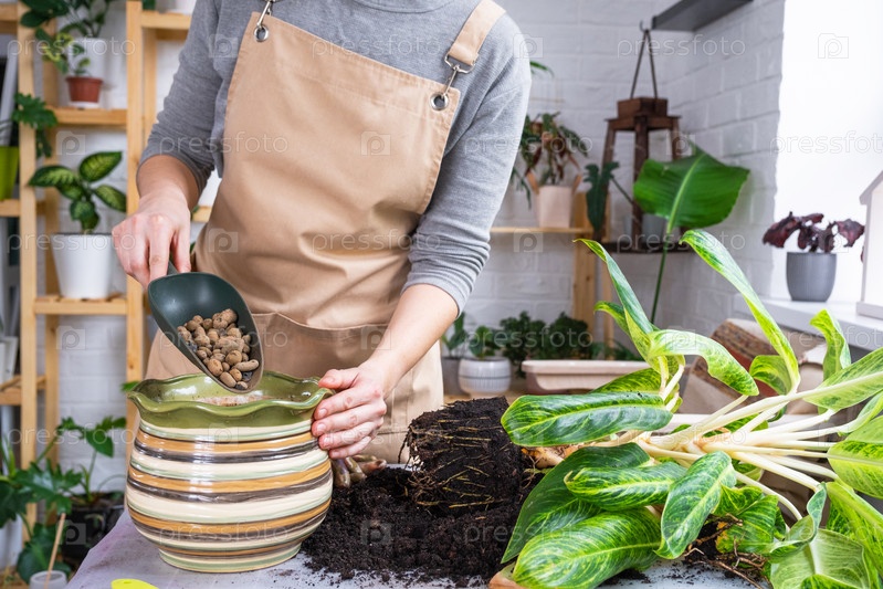 Пересадка домашнего растения аглаонемы в новый горшок в интерьере дома. женщина в фартуке наливает глиняный дренаж в горшок для слива и дыхания корней