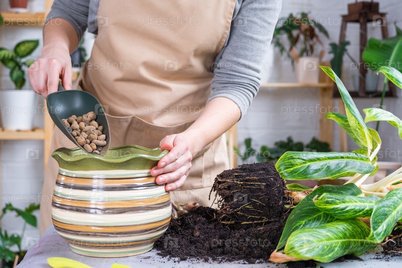 Пересадка домашнего растения аглаонемы в новый горшок в интерьере дома. женщина в фартуке наливает глиняный дренаж в горшок для слива и дыхания корней