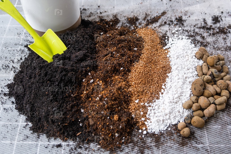 Состав грунта для домашних горшечных растений, торф, земля, песок, перлит, вермикулит, кокос. Смесь для посадки растений в горшок. Макет