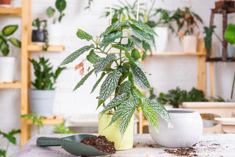 Пересадка домашнего растения Бегония пятнистая снежная шапка в горшок большего размера. Раскладка инвентаря на столе в интерьере, уход за горшечным растением
