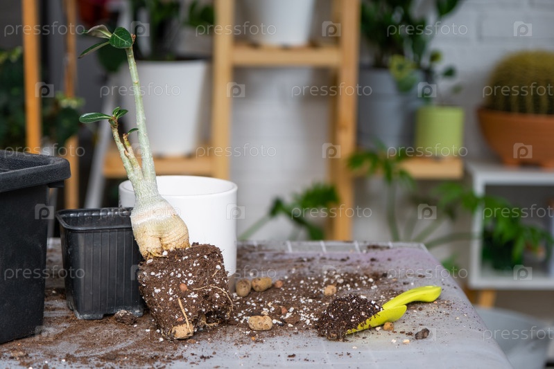 Пересадка домашнего растения суккулентного адениума в новый горшок. Уход за растением в горшке, раскладка на столе с почвой, лопатой