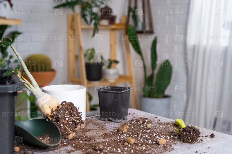 Пересадка домашнего растения суккулентного адениума в новый горшок. Уход за растением в горшке, раскладка на столе с почвой, лопатой