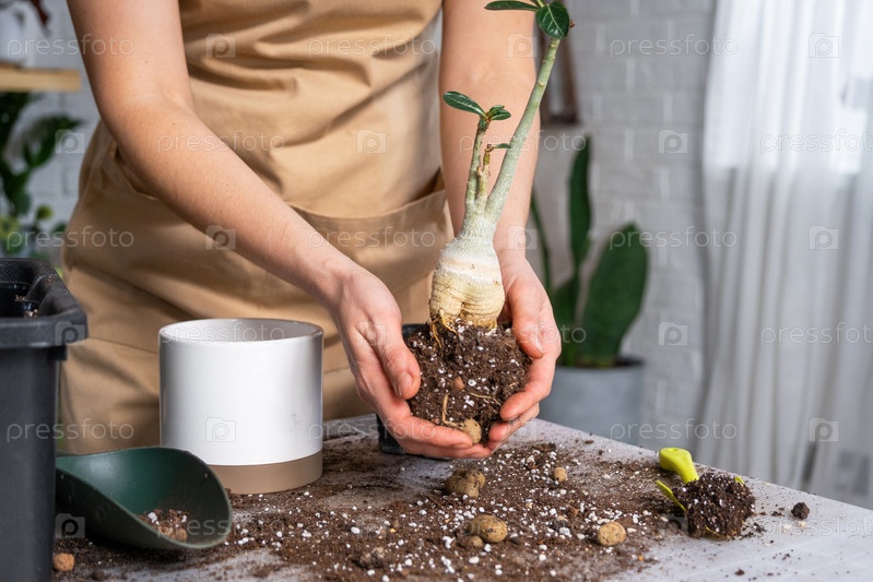Пересадка домашнего растения суккулентного адениума в новый горшок. Уход за растением в горшке, раскладка на столе с почвой, лопатой, руками женщины в фартуке