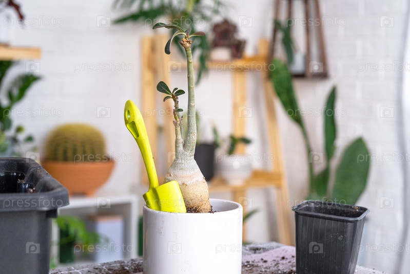Пересадка домашнего растения суккулентного адениума в новый горшок. Уход за растением в горшке, раскладка на столе с почвой, лопатой