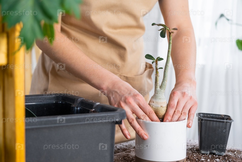 Пересадка домашнего растения суккулентного адениума в новый горшок. Уход за растением в горшке, раскладка на столе с почвой, лопатой, руками женщины в фартуке