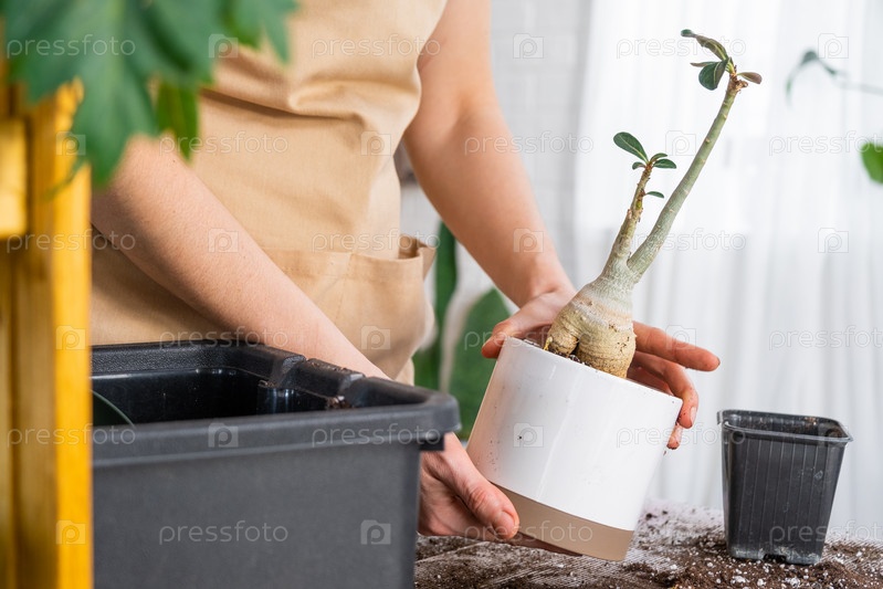 Пересадка домашнего растения суккулентного адениума в новый горшок. Уход за растением в горшке, раскладка на столе с почвой, лопатой, руками женщины в фартуке