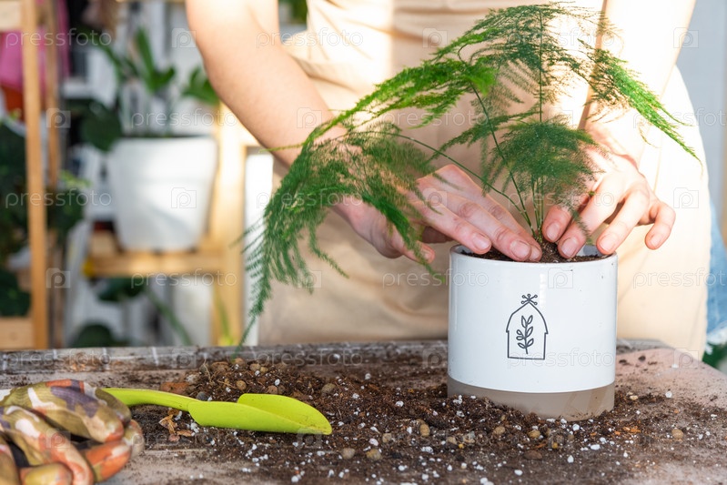 Пересадка домашнего растения спаржи в горшок на стол с почвой для пересадки. Уход за горшечным растением, выращивание домашних растений