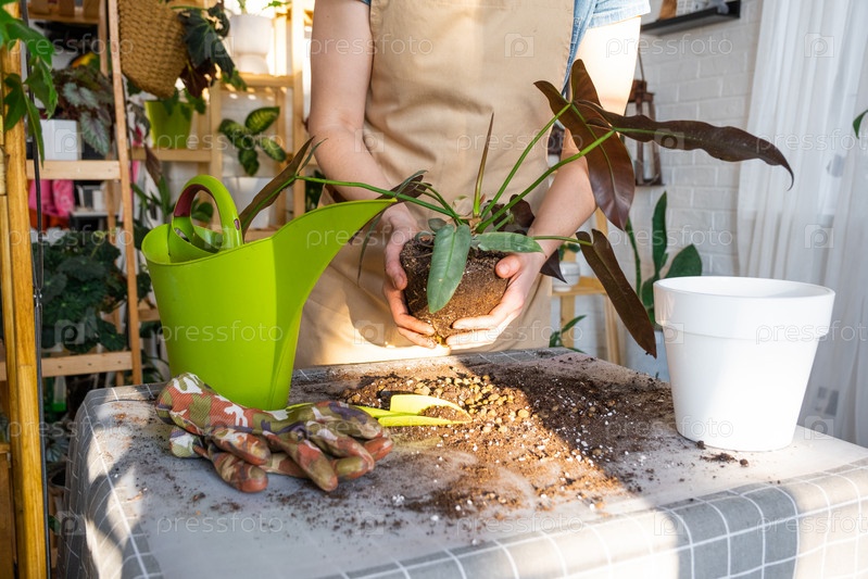 Пересадка домашнего растения Philodendron Santa Leopoldina в новый горшок в интерьере дома.Уход за горшечным растением земляной ком с корнями