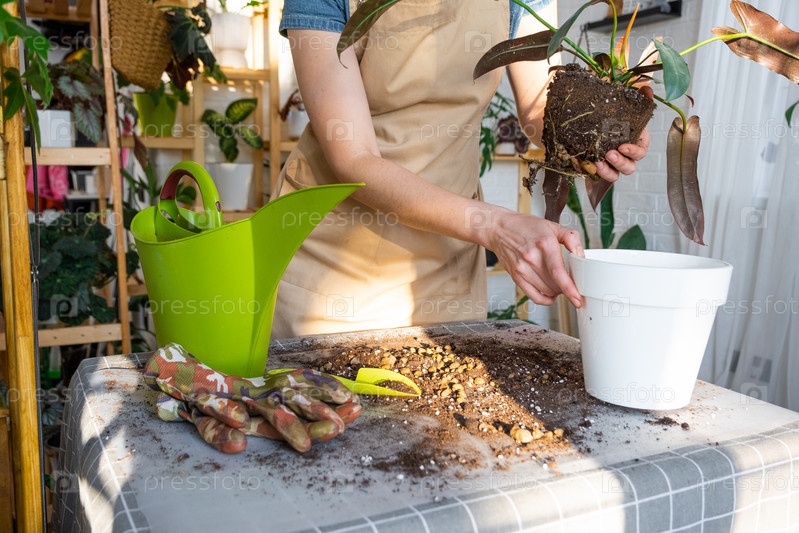 Пересадка домашнего растения Philodendron Santa Leopoldina в новый горшок в интерьере дома.Уход за горшечным растением земляной ком с корнями