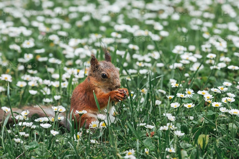 Лето. Портрет пушистой рыжей белки с орехом в лапах на зеленой траве в окружении маргариток. Белки в городском парке Царицыно. Кормление животных