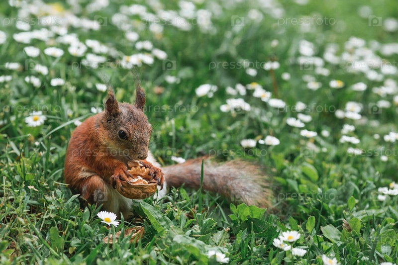 Лето. Портрет пушистой рыжей белки с орехом в лапах на зеленой траве в окружении маргариток. Белки в городском парке Царицыно. Кормление животных