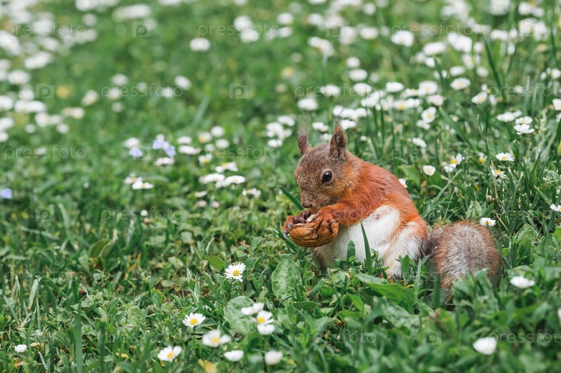 Лето. Портрет пушистой рыжей белки с орехом в лапах на зеленой траве в окружении маргариток. Белки в городском парке Царицыно. Кормление животных