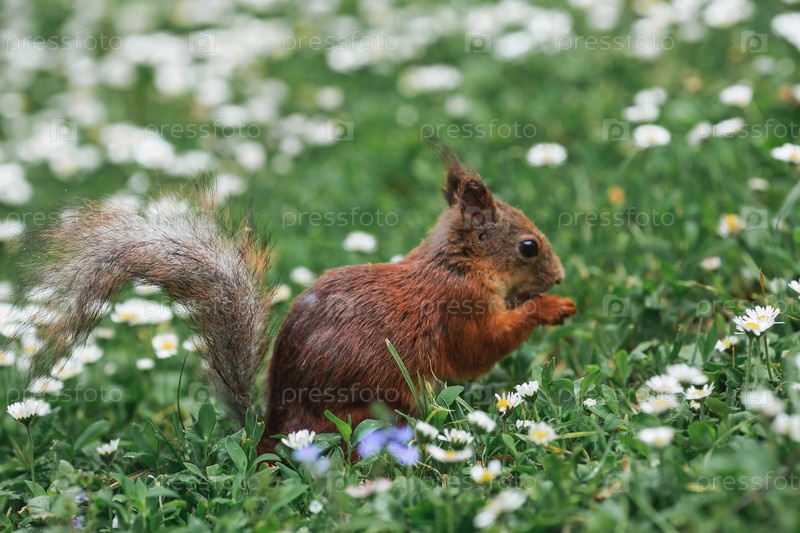 Лето. Портрет пушистой рыжей белки с орехом в лапах на зеленой траве в окружении маргариток. Белки в городском парке Царицыно. Кормление животных
