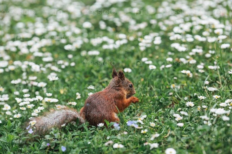 Лето. Портрет пушистой рыжей белки с орехом в лапах на зеленой траве в окружении маргариток. Белки в городском парке Царицыно. Кормление животных