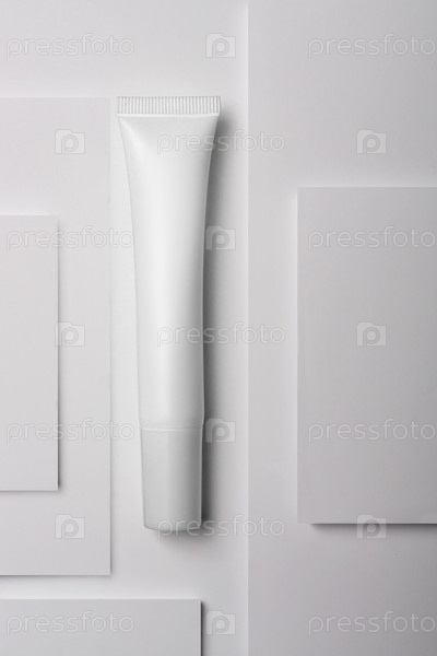 Тюбик для глаз с кремом, тональным кремом, консилером на белом многослойном фоне подиума. Женский гигиенический косметический аксессуар для ухода за кожей. Скопируйте космический макет