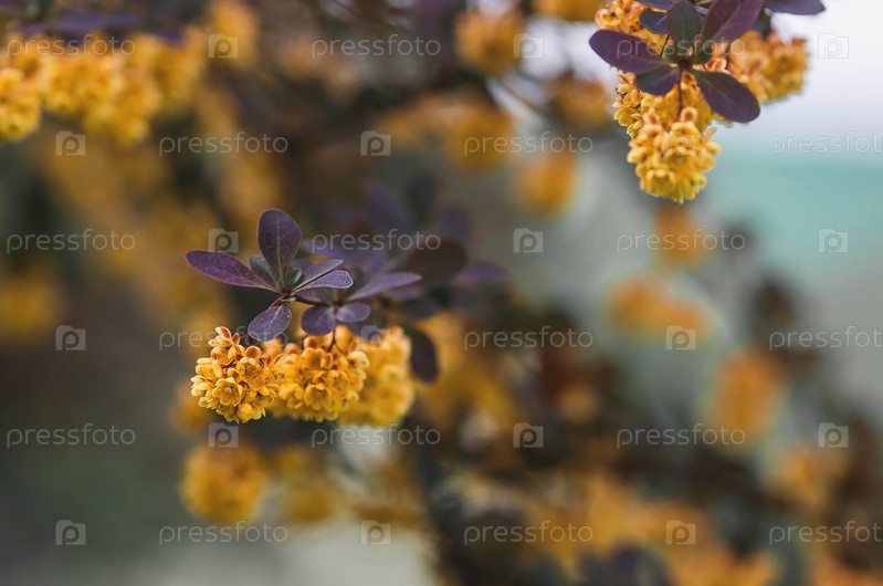 Куст из семейства барбарисовых Барбарис. (лат. B.rberis vulg.ris). цветение барбариса весной. желтые цветы в крупном плане
