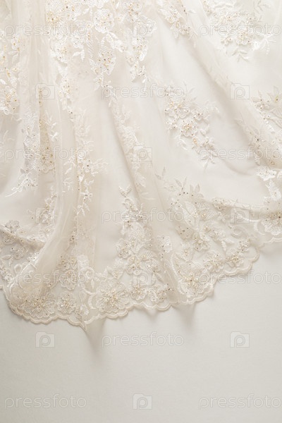 Нежное французское кружево, богато украшенное бисером и жемчугом. часть свадебной фаты или платья невесты. Вертикальный вид