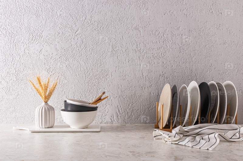 Набор керамических тарелок на кухонной сушилке и миски на кухонной столешнице. Серый текстурированный фон стены с пространством для текста. минимализм