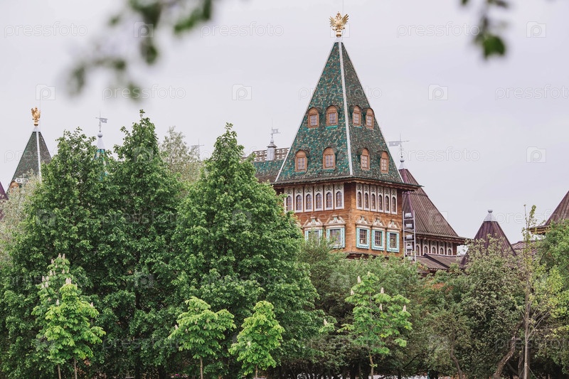 Городской ландшафт. Популярная туристическая достопримечательность. Визитная карточка Москвы. Деревянный дворец царя Алексея Михайловича в Коломенском. Россия, Москва, май 2023 г