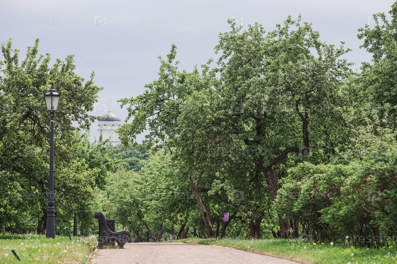 Весенний яблоневый сад и скамейки в Коломенском парке, на заднем плане — купол церкви Георгия Победоносца. Красивый естественный зеленый фон
