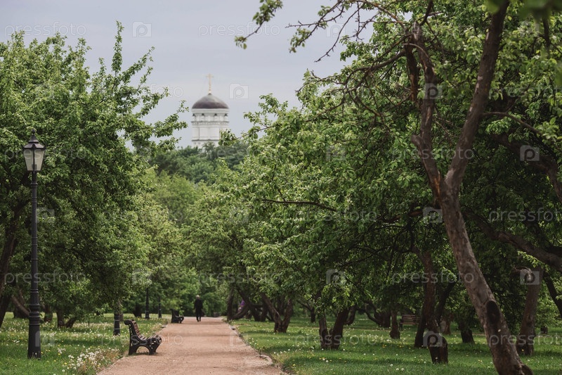 Весенний яблоневый сад и скамейки в Коломенском парке, на заднем плане — купол церкви Георгия Победоносца. Красивый естественный зеленый фон