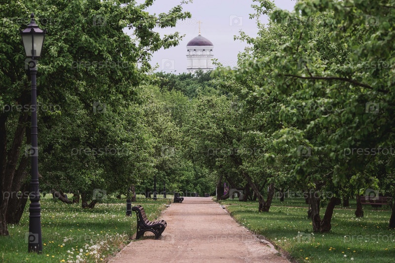 Весенний яблоневый сад и скамейки в Коломенском парке, на заднем плане — купол церкви Георгия Победоносца. Красивый естественный зеленый фон