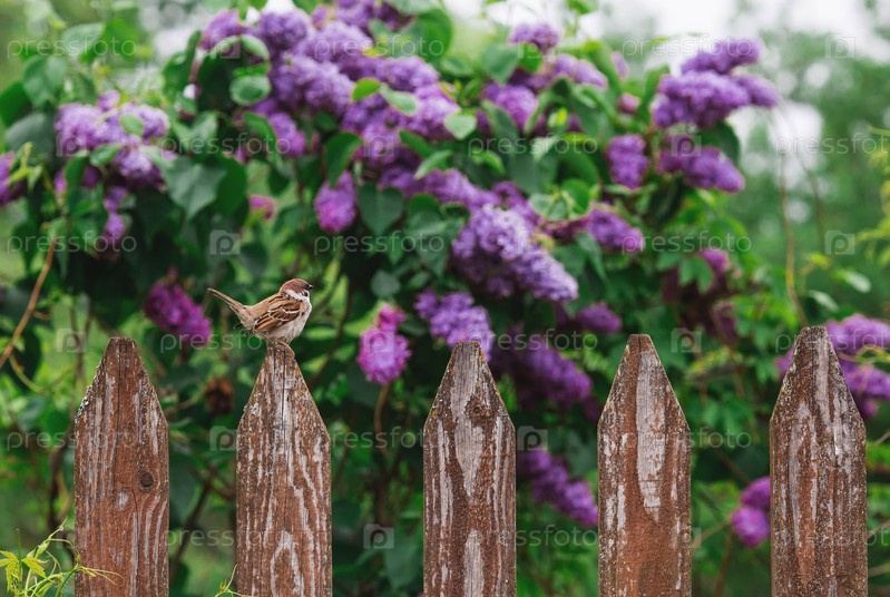 Птицы. Маленький воробей на деревянном деревенском заборе и куст ярко-фиолетовой сирени на заднем плане. Пушистая, цветущая сирень. Красивый естественный фон. Крупные гроздья сирени