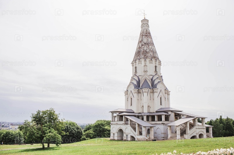 Архитектурная достопримечательность Вознесенской церкви в Коломенском парке весной. Известное московское место и туристическая достопримечательность. Визитная карточка Москвы. Коломенский парк, Москва, май 2023 г