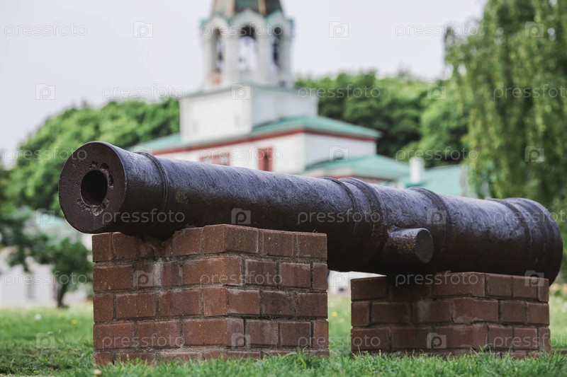 Москва, Коломенское. Крепостная пушка, участвовавшая в Полтавской битве 1709 года, на фоне парадных ворот в парке