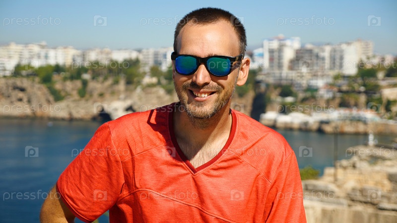 Красивый мужчина в солнечных очках на заднем плане - море и город. Кавказский мужчина в красной футболке на фоне красивого морского пейзажа с горами