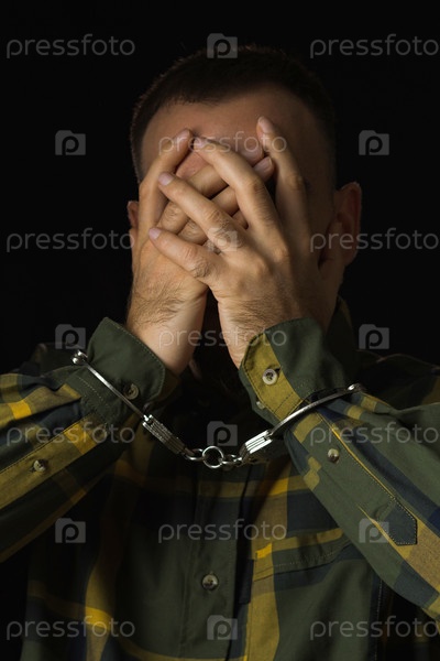 Заключенный-мужчина с руками в наручниках на черном фоне. Портрет мужчины в зеленой клетчатой рубашке с манжетами, закрывающими лицо руками