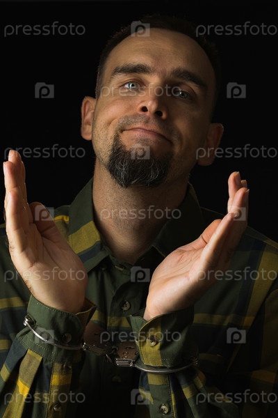 Бородатый мужчина в наручниках с разведенными ладонями. Белый мужчина в зеленой клетчатой рубашке на черном фоне. Выражение лица разыгрывается