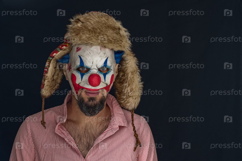 Бородатый мужчина в жуткой клоунской маске и шляпе с ушами смотрит в камеру, стоя в темной комнате. Страшный клоун в красной полосатой рубашке крупным планом. Клоун-маньяк