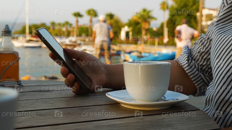 Крупный план чашки белого чая на блюдце. На фоне размытая женщина, листающая пальцем экран смартфона, пьющая чай. Красивый закатный свет. Ужин в кафе на берегу