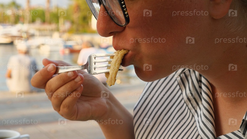 Женщина ест жареную рыбу. Крупный план женщины в очках, обедающей в кафе у моря. На заднем плане море, люди и лодки. Вид сбоку