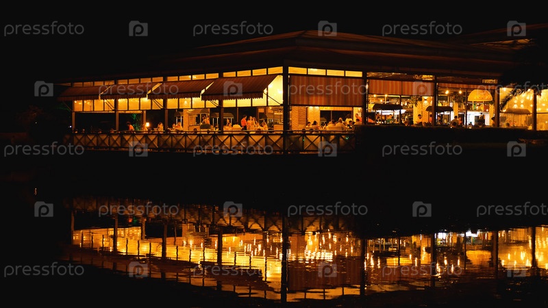 Работа ночного кафе в городе у воды. Красивое отражение в воде. Люди едят за столиками, официанты на работе. Ночная жизнь города