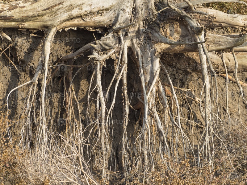 Корни дерева на осыпающемся глиняном песчаном берегу. Сухие корни и основание ствола дерева, выставленные осыпающимся берегом